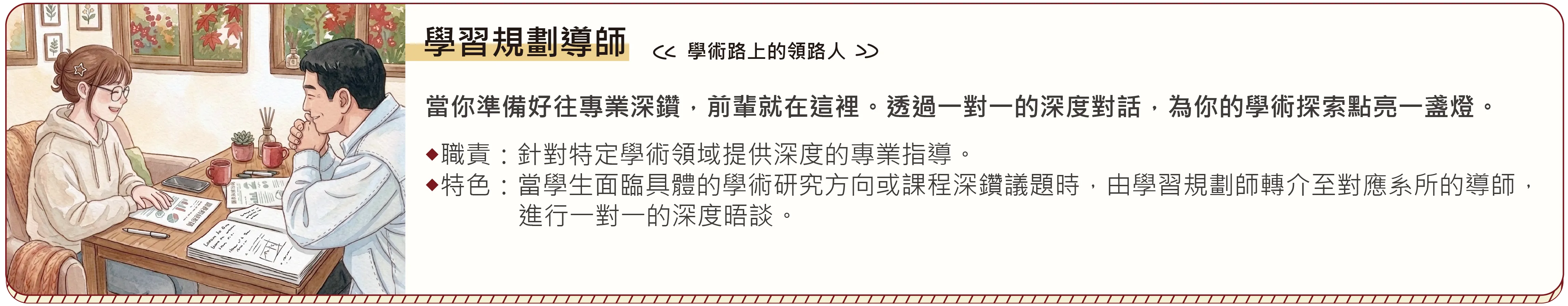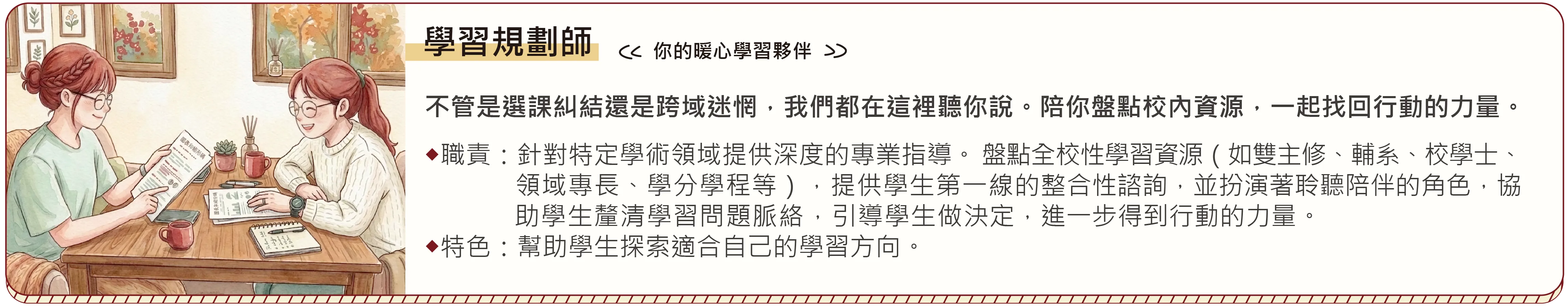 在多元學習的時代,學生常面臨跨系、跨領域學習的「資訊孤島」困境。臺中教育大學秉持「以學生為本」的承諾,啟動「學習規劃諮詢服務」。我們不只提供行政資訊的窗口,更是引導學生有效利用校內資源,並協助學生量身打造大學四年學習藍圖的服務團隊。